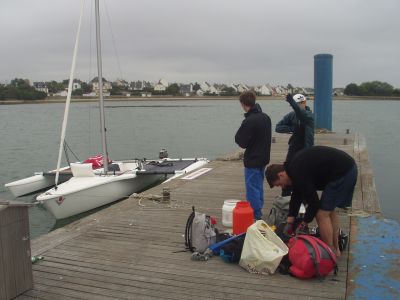 Après avoir monté les bras et mis en place les trampolines, le gréement monté et le matériel de sécurité vérifié; nous avons emmené le bateau au ponton.
