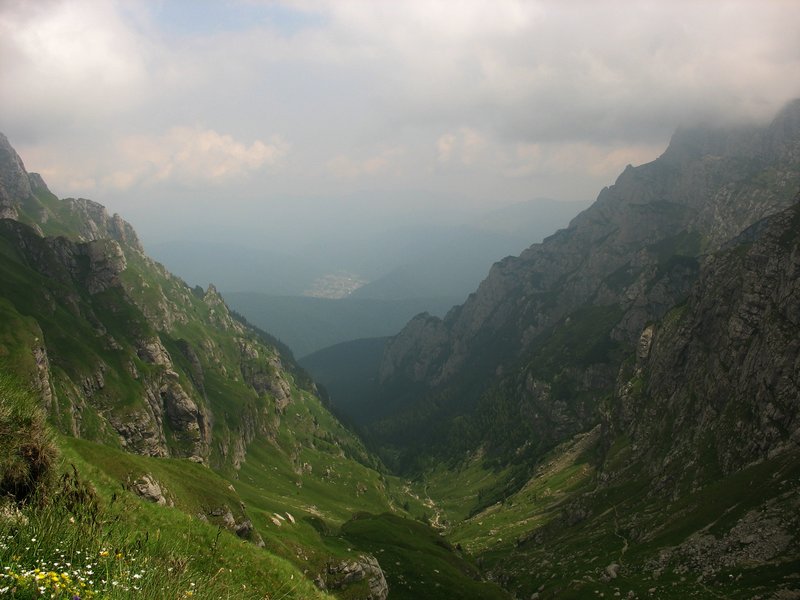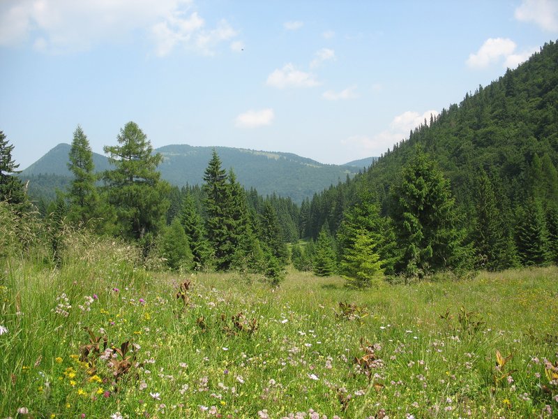 Après la première heure de marche, le bois s'éclaircie jusqu'à déboucher sur de vastes prairies sauvages de montagne : le soleil, l'herbe grasse et les fleurs basses de montagne forment un magnifique décors qui me rappelle quelque peu des vacances d'enfance dans les Alpes. Mais les pentes qui enserrent le vallon sont si escarpées et rocailleuses qu'elles dégagent une brutalité que j'ai rarement ressentie dans les massifs français. Juste avant le carrefour de Poiana (=prairie) Castilei, je croise un deuxième groupe de randonneurs qui ne manquent pas de me mettre en garde à nouveau contre les habitants velus de la région.
