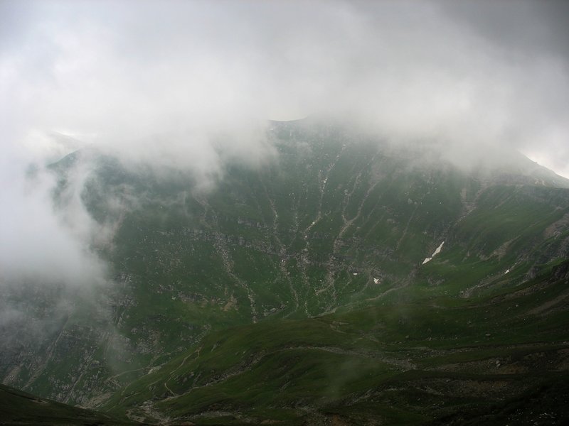 Quelques minutes plus tard, j'entame le circuit en lacets qui monte vers le sommet. J'ai déjà bu plus de la moitié de mon eau, et je dois me résoudre à arrêter de boire avant le sommet. Heureusement, il fait beaucoup moins chaud: l'altitude et l'humidité des nuages apportent même un courant frais et à la vue de quelques névés, j'enfile mes couvres-bras. Petit à petit la vallée Cerbului disparaît entre les versants couvert de brume nuageuse et je n'ai d'yeux que pour l'ascension.