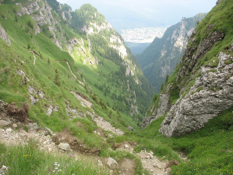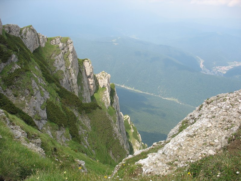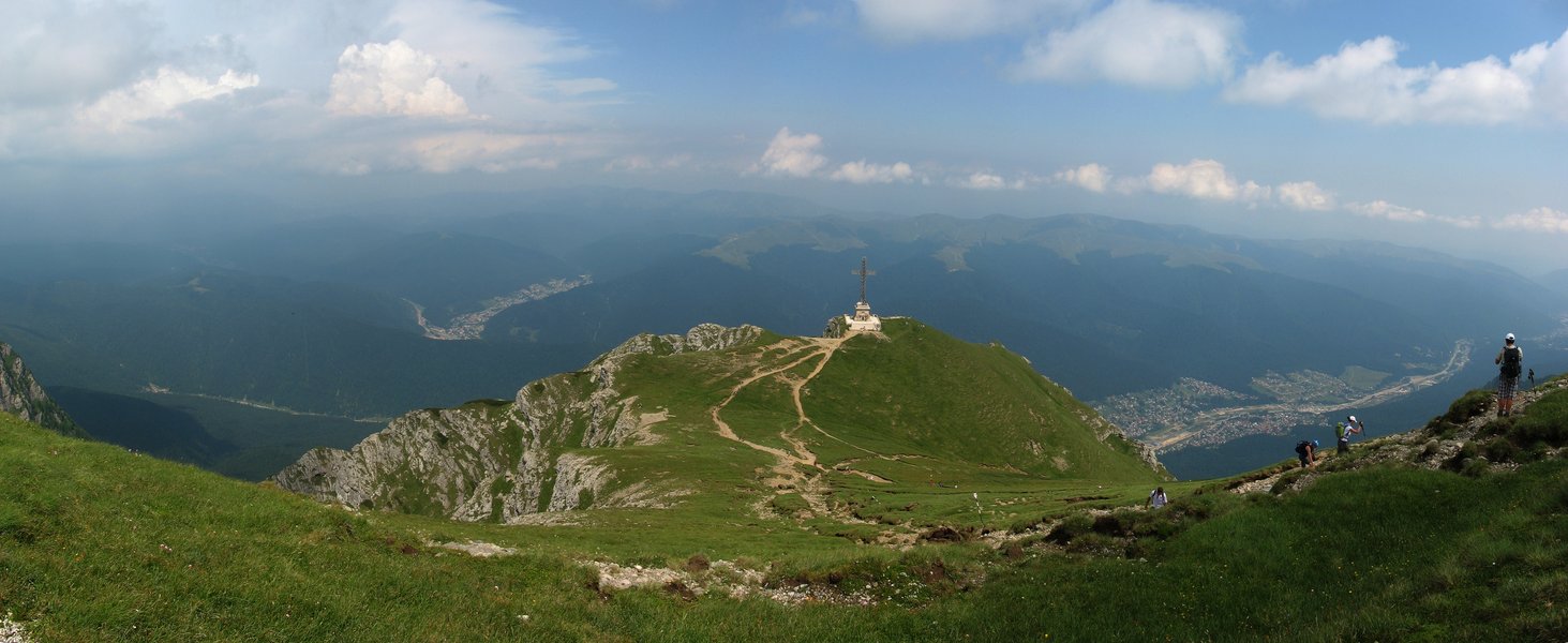 Alors que le chemin vire plein Est, je m'attends à rencontrer un point de vue sur la vallée de Busteni. Je suis d'abord déçu que le chemin descende en pente douce, mais lorsque je découvre "La Croix de la Victoire" je ne peux qu'esquisser un sourire de plaisir. La nature a aménagé ici une véritable vigie dans un promontoire rocheux dominant la vallée – qui semble ridiculement étroite – mais aussi les monts qui s'étendent à l'Est et au Sud sur des dizaines de kilomètres. La gorge sèche, les jambes sciées, le visage chaud et salé, je défais mon sac et m'assieds dans l'herbe pour profiter du panorama exceptionnel.