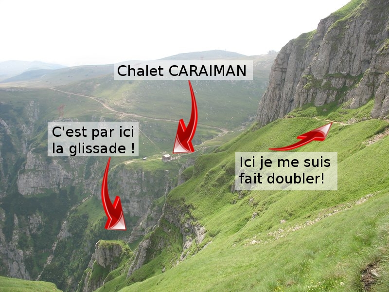 Je dévale la pente, glissant à plusieurs reprise dans la rocaille et me rattrapant in extremis. Le terrain difficile n'aide pas du tout mes jambes lourdes. Après un passage par le monument aux héros de la Roumanie, je continue vers le chalet de Caraiman, dans l'espoir de trouver un chemin descendant vers Busteni.
