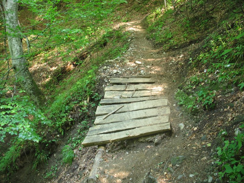 Le chemin de terre et de cailloux laisse place à une section d'escalade à même la roche : quelques endroits sont aménagés pour les marcheurs : des câbles de fer amarrés à la roche permettent d'avoir une main-courante au-dessous des passages dangereux. Parfois un appui en bois est installé pour éviter de devoir sauter au-dessus d'une roche, et deux ponts sont même installés là où le sentier s'effondre. Malheureusement, plusieurs point d'amarrage sont décrochés, ce qui donne quelques surprises en se tenant aux câbles ! Les appuis en bois sont vacillants et les ponts sont...plutôt dangereux.