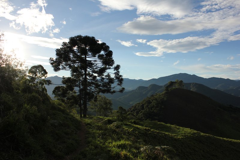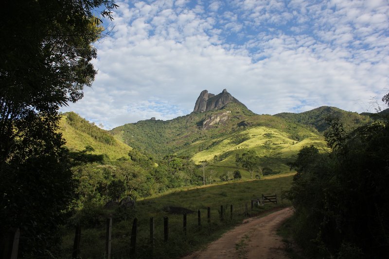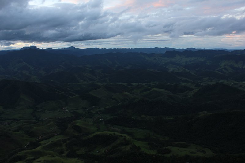 Il est 15h30 lorsque je fini mon sac : c'est déjà tard ! Je commence une course contre la montre : il faut absolument que je sois là-haut avant le coucher du soleil, pour m'installer à la lumière du jour et surtout pour tirer le portrait au crépuscule. Après 10min d'autoroute, je m'engage sur la RJ-163 : véritable circuit de rally -asphalte- qui slalome entre les collines. Puis j'attaque l'ascension de 10km qui me permet de passer dans la vallée de Maua. En haut du col, la vallée est superbe, éclairée par une superbe luminosité d'après-midi. Pas de temps à perdre : je glisse vers Visconde de Maua et oblique à droite vers la piste : avec les averses de ces dernières semaines la route est détrempée et défoncée. Garé sur un carré d'herbe au pied de la montagne, je chausse mes baskets, charge mon sac et m'élance à grands pas. Sous le soleil déclinant, le paysage ne s'assombrit pas, mais se contraste, comme pendant les premiers après-midi d'automne. Si je ne connaissais pas le rocher, je resterais ici pour le reste de la soirée... Mais il ne faut pas se fier à cette lumière : d'ici une heure le soleil sera derrière les montagne et la vallée noyée dans l'obscurité.