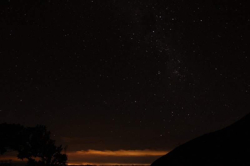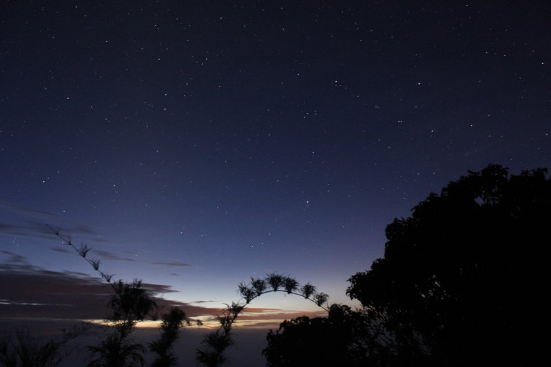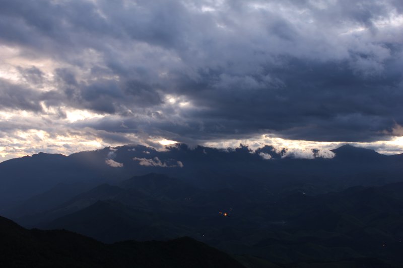 Dès le soleil couché, les nuages se dispersent et me découvent un ciel aussi clair que j'en ai rêvé. Allongé dans ma chaise de plage, mon oreiller glonflable sous la tête, j'ai les yeux grands ouverts sur ce moment magique où la Terre et le Ciel opèrent une métamorphose fantastique : la Terre s'éteint et progressivement le Ciel s'allume pour ceux qui le regardent. J'en profite pour prendre cette photo : les nuages descendus dans la vallée reflètent les lumières de la ville (Itatiaia), et aveuglent complètement la vallée ; au-dessus des nuages, les étoiles sont pourtant là.
