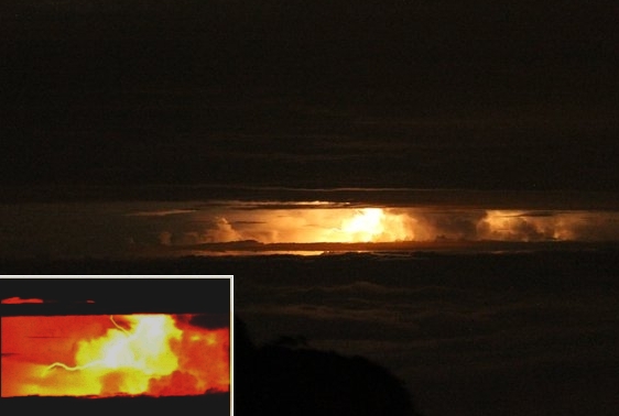 Avant d'être touché, je prends quelques photos d'un orage au loin : pendant les flashes, je distingue clairement que mon perchoir est situé au-dessus d'un parterre de nuages. Je vois clairement les cumulonimbus émerger de la surface nuageuse, lorsqu'ils semblent exploser dans l'Espace.