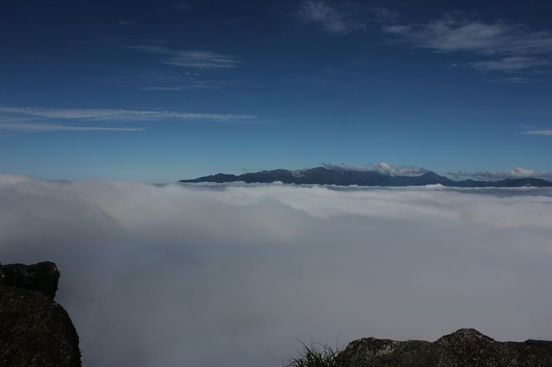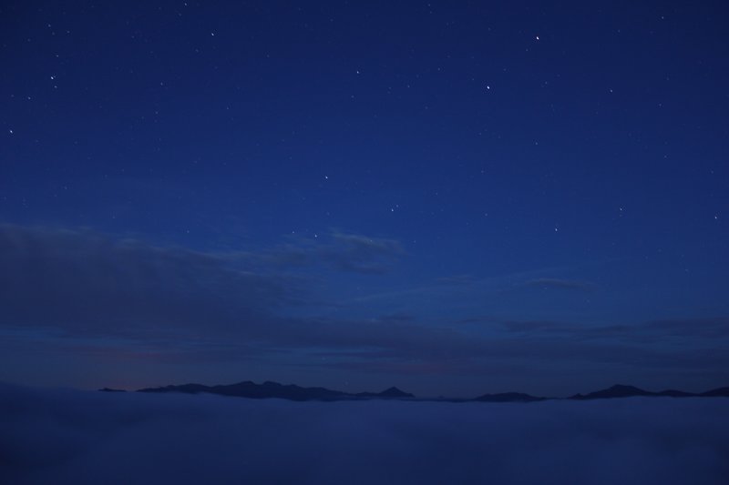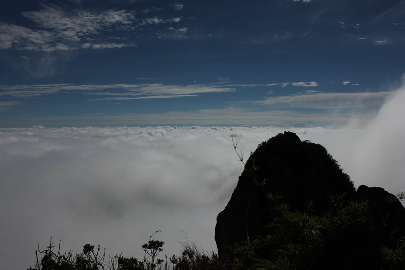 Ce n'est pas fini : une seconde vague avance, cachant un par un tous les sommets des montagnes alentour. Les étoiles les plus basses s'éteignent également, prises dans un voile de brume puis caché par un mur opaque. Comme un phare dans la tempête, mon rocher est balayé par des voiles d'humidité, comme des embruns de déferlantes ; il tient bon et les étoiles à ma verticale sont encore claires, je ne suis pas encore submergé. Mais vague après vague, la marée de nuage monte en me fermant l'horizon : les dernières montagnes ont disparu et même le second pic de Pedra Selada, à quelques dizaines de mètre seulement, vient de sombrer.
