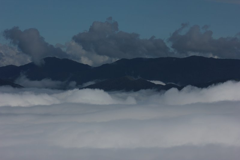 Il est 3h30 du matin. La nuit est tombée à 19h, les orages sont arrivés vers 21h et repartis vers 23h sans me toucher. La brume m'a enseveli juste après, et depuis, je n'ai pu qu'entrevoir vaguement le ciel. Cela fait bientôt 4h que je suis pris dans une nasse d'humidité : je suis détrempé, mes affaires ruissellent de micro-goutellettes. J'ai dormi quelques heures, avec mon appareil photos calé contre moi. Je crois qu'il n'est pas mouillé, mais j'ai les pieds et les genoux mouillés et congelés. Après 6 mois de chaleur brûlante et tant de nuits étouffantes, voilà que je prie pour me réchauffer ! Je sens aussi que malgré mon équipement, je suis en train d'attraper un gros coup de froid à respirer l'air insalubre de cette brume.