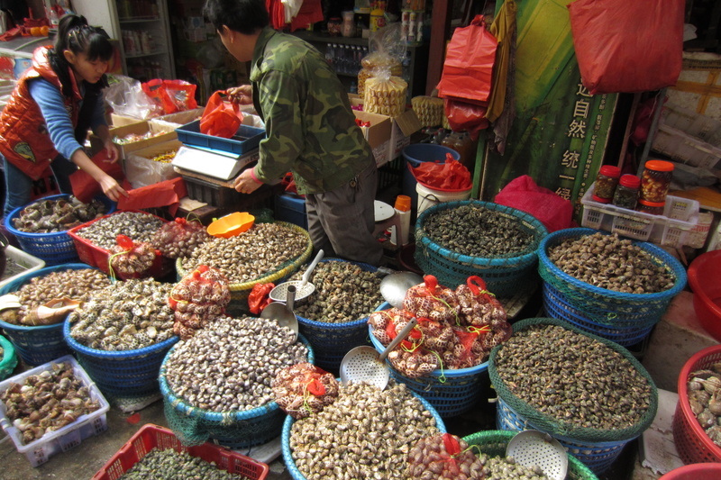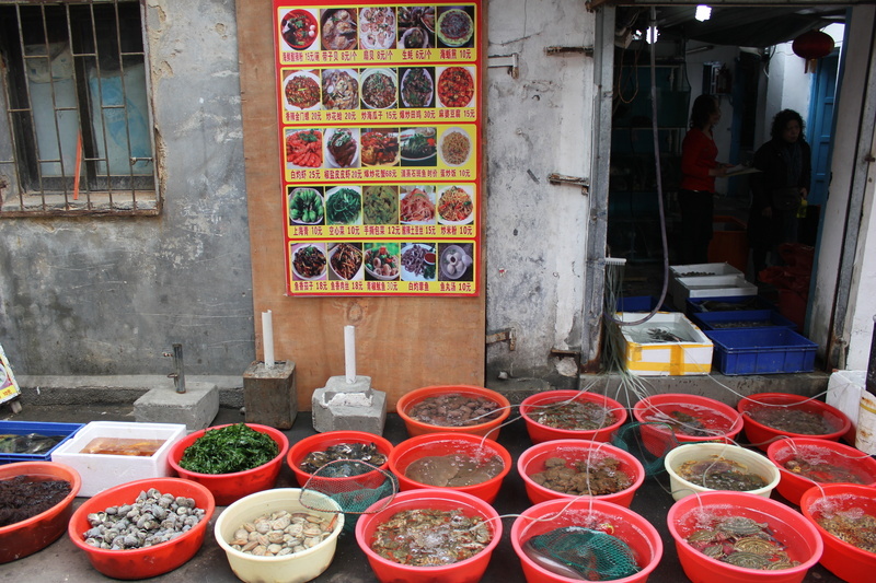 Même type de marché sur l'île de Gulangyu : les restaurants exposent leurs poissons dans la rue : si l'un vous tente, vous n'avez qu'à monter à l'étage pour le déguster frit!