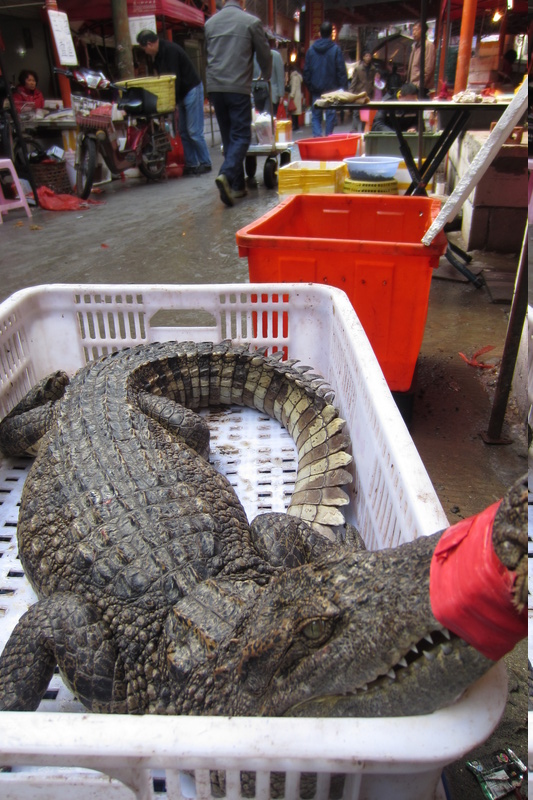 Au détour d'une bassine, on peut trouver des spécimens rares, comme des raies, des tortues et ce petit spécimen de crocodile vivant.
