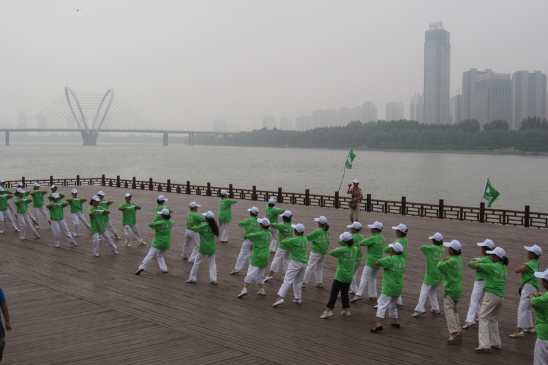 Autour de la rivière, on peut voir les chinois pratiquer toutes sortes d'activités, comme dans tous les parcs de la ville. Le soir, les grand-mères se réunissent pour faire des chorégraphies en musique. Ce matin j'assiste à ce qui semble être une répétition de parade. Peut-être pour une cérémonie des jeux nationaux chinois, qui se dérouleront ce mois-ci dans la province de Shenyang (Liaoning).