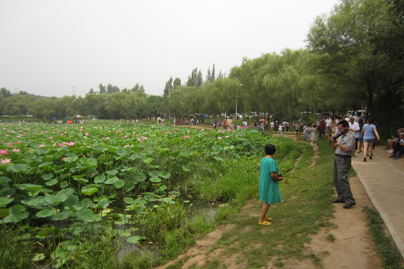 Surprise : les chinois sont massés autour d'un petit étang à lotus en fleurs!