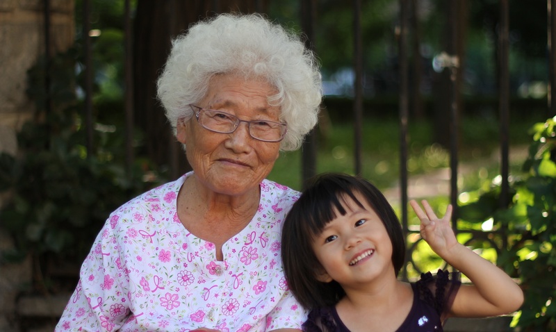 Deux jolies et souriantes générations qui attendent le bus à l'ombre.