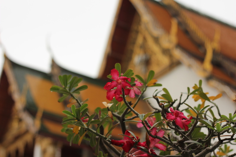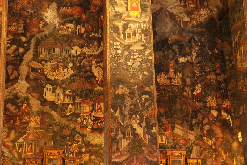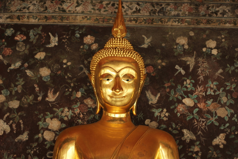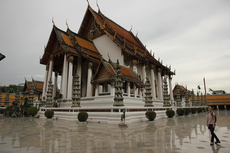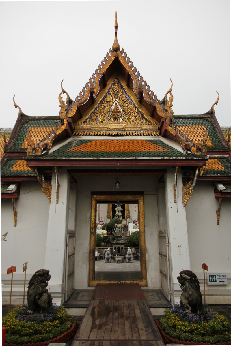 Après avoir déambulé 2 heures dans Bangkok, dans le bruit incessant des scooters, des tuk-tuks, dans la fumée des bus et dans l'effervescence des rues, l'enceinte calme du temple nous semble soudain un sanctuaire oublié au sommet d'une montagne. Les gaz d'échappement on laissé la place à d'entêtantes effluves d'encens ; le bruit et la grisaille se sont évanouis dans les espaces et les formes épurées du temple. L'agitation se mue alors en une démarche lente, sereine, élevée par les lignes de fuite des bâtiments, le regard glisse d'une forme à l'autre et se prépare instinctivement à l'admiration. La mécanique de l'adoration est en route...