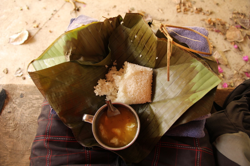 En partant de Bannamhoo, j'ai eu une petite incompréhension avec mon hôte : je ne savais pas si elle me proposait de reprendre du riz pour le petit-déjeuner ou d'en emporter pour le déjeuner sur la route. J'ai dis "oui" autant pour être gentil que parce que j'avais faim. Elle m'a finalement préparé un superbe plat "à emporter". Après avoir passé rapidement deux feuilles de bananier au feu, elle a emballé un grosse portion de riz, a hermétiquement plié les feuilles et noué le tout avec des fibres de bambou. Avec un peu de jus de bouillon -elle avait choisi un des meilleurs morceaux de viande-, j'avais un délicieux plat pour le déjeuner!